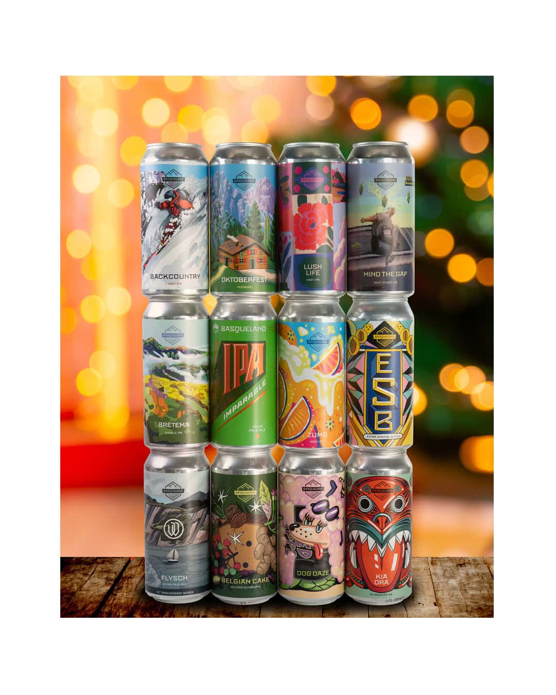 • 12 × 44 cl cans: Backcountry, Belgian Cake, Dog Daze, Lush Life, Zumo, Extra Special Bitter, Brétema, Mind the Gap, Oktoberfest, Kia Ora, Flysch, and Imparable.